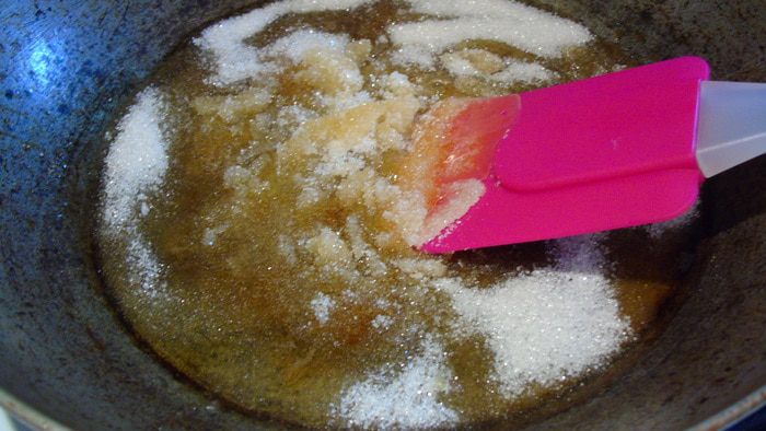 Начнем с тыквы. Сахар с ванилью карамелизируйте на сковороде с толстым дном