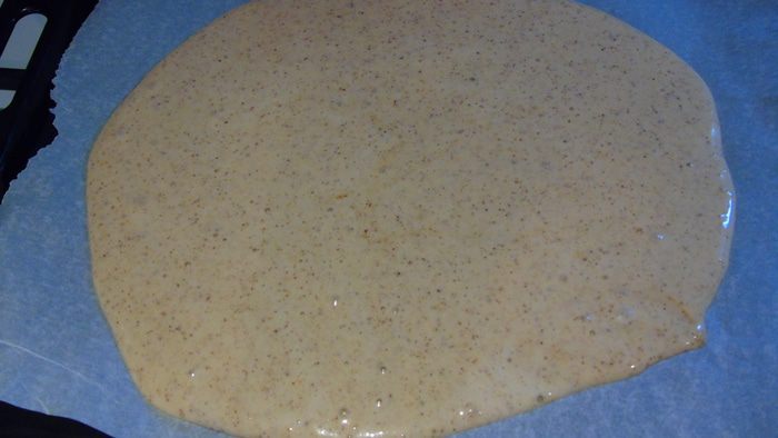 Вылейте тесто на застеленный пергаментом противень и отправьте выпекаться на 8-10 минут. Ориентируйтесь по своей духовке, проверьте готовность спичкой.
