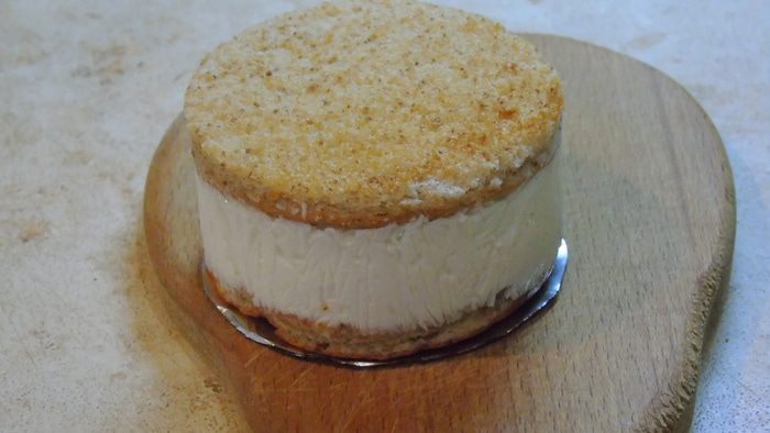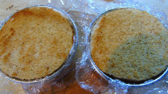 Закрываем вторым кругом бисквита, прижимаем поплотней и отправляем в холодильник на ночь.