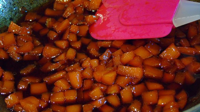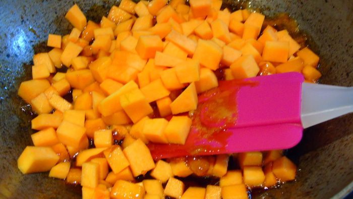 Тыкву очистить от кожуры, нарезать кубиками и добавить к карамелизированному сахару, добавьте сливочное масло и ликер (по желанию, можно пропустить). Держите на среднем огне до мягкости, время от времени помешивая, тыква пустит сок.
