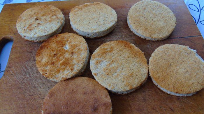 Готовому бисквиту дайте остыть, снимите бумагу и нарежьте кружками диаметром 6 или 8 см.