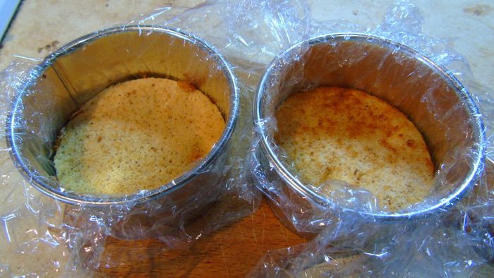 Кольцо 6 или 8 см выложить пленкой, на дно положить первый круг бисквита.