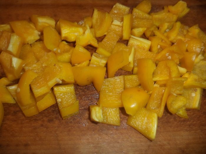 Цуккини нарезать тонкими ломтиками. Мякоть болгарского перца нарезать небольшими кусочками.
