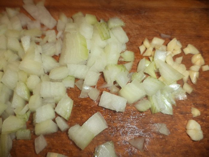 Лук и чеснок очистить, порубить кубиками. Выложить на сковороду, в которой обжаривались фрикадельки. Обжарить до прозрачности.