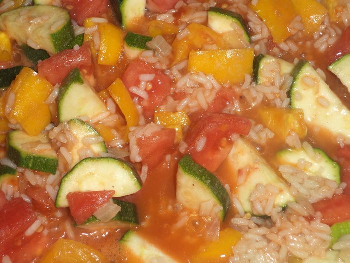 Добавить к рису цуккини и перец, томатную пасту, кусочки консервированных помидорок, перемешать, тушить под крышкой ещё 5 минут.