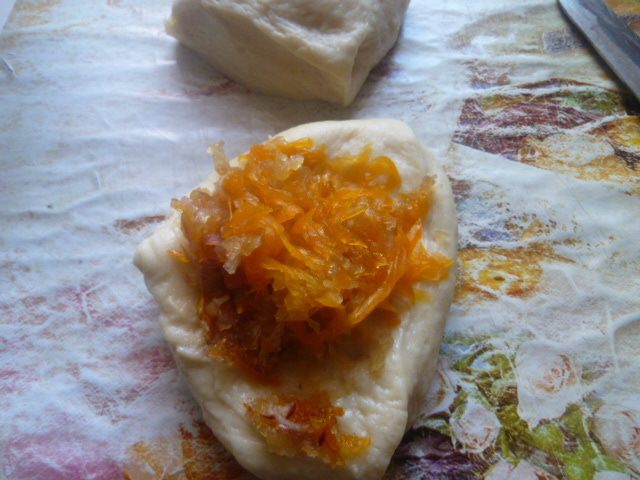 Тесто я замешиваю в хлебопечке. На дно ведерка сначала наливаю растопленный смалец и растительное масло, затем добавляю молоко и яйцо, соль и просеянную муку (у меня стакан граненый 250 мл), сверху дрожжи быстрорастворимые, сахар (4 ст. л.) и ванильный сахар.