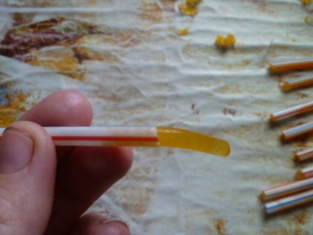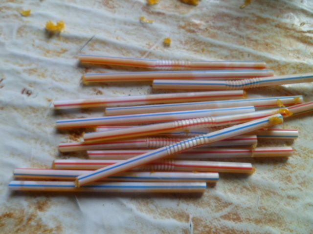 Вообще то я хотела попробовать сделать червячков, но соломинки плохо наполнились, так как это не сок, а мякоть. Соломинки я разрезала на 2 части и поставила плотно в стопку, затем понемногу заливала желе.