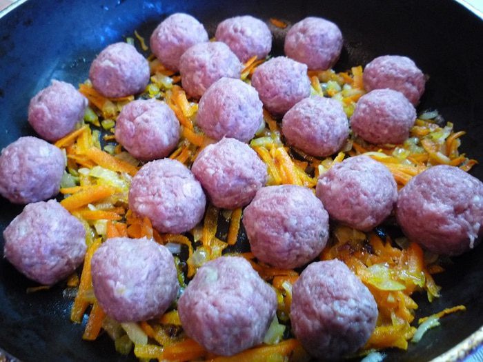 Лук и морковь перемешать, положить сверху фрикадельки и жарить в течении 20 минут, периодически помешивая.
