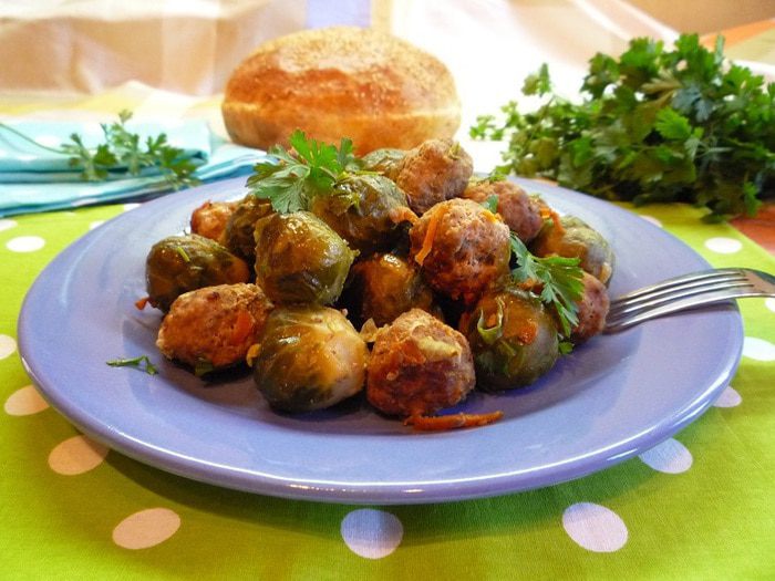 Подавайте брюссельскую капусту с фрикадельками с соевым соусом, сметаной и свежей зеленью! Приятного аппетита!