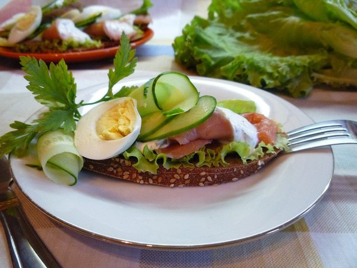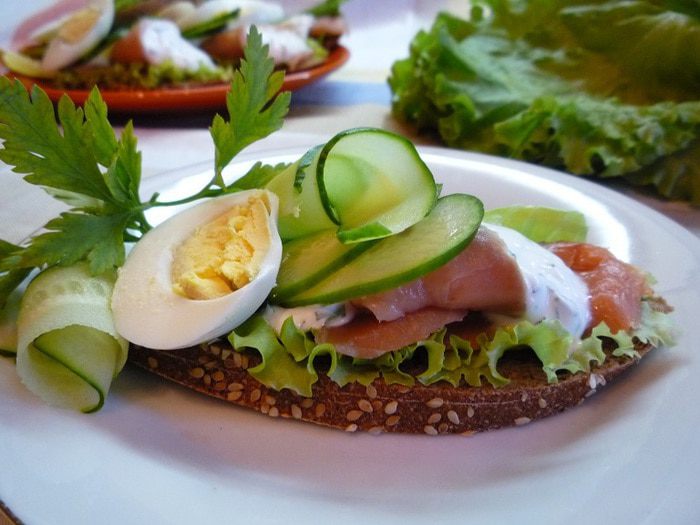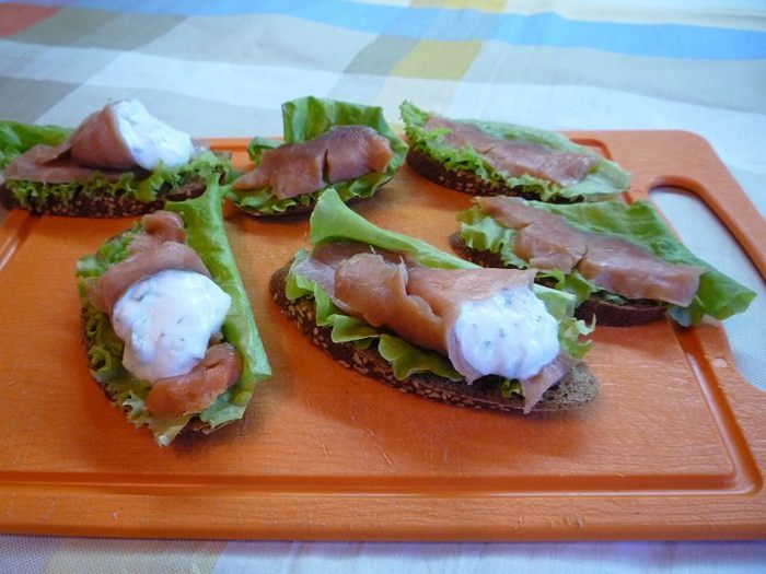 Остальные ломтики рыбы свернуть конвертиком, положить в них по ложке йогурта и выложить их сверху на бутерброды.