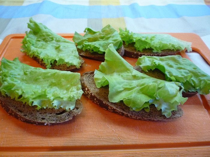 Хлеб нарезать тонкими ломтиками, каждый ломтик смазать сливочным маслом, положить сверху листики салата и одному ломтику лосося на каждый бутерброд.