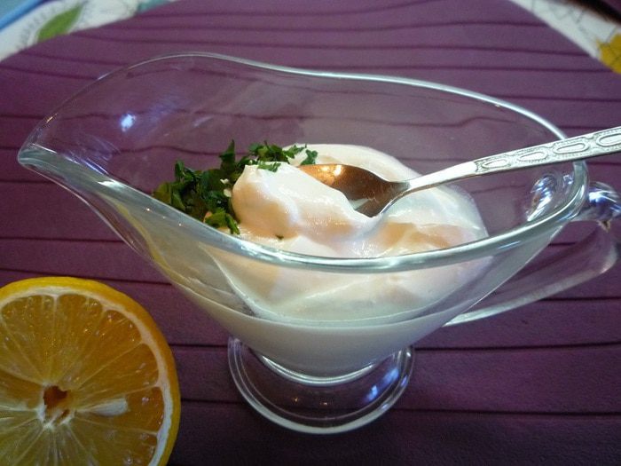 В йогурт добавить мелко нарезанную петрушку и немножко лимонного сока.