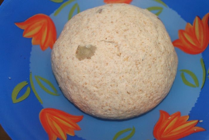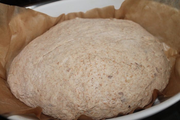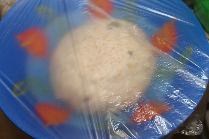 Укладываем тесто в миску смазанную маслом и затягиваем пленкой. Пусть постоит часа 2. Вы увидите как оно подрастет. Да, через пол часа после брожения тесто необходимо обмять и снова затянуть пленкой.