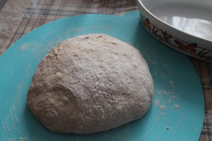 Тесто еще обмять и если понадобится немного подпылить мукой, чтобы сильно к рукам не липло. Но, и много муки сыпать не стоит. У меня на подпыл ушла 1 столовая ложка без горки.