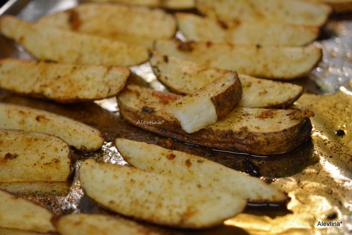 Смазать картофель по отдельности смесью пряной. Посыпать черным молотым перцем. Поставить в духовку на 30 минут.