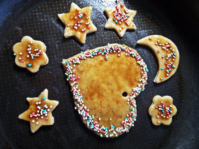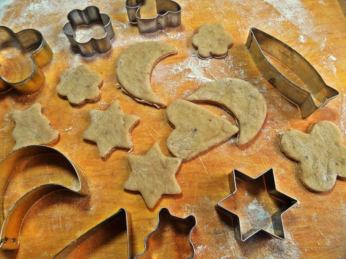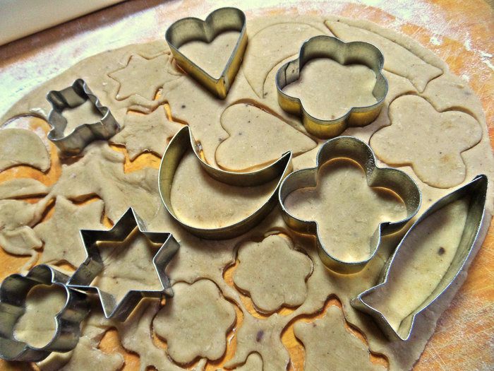 Раскатываем тесто в тонкий пласт и вырезаем вместе с детьми.