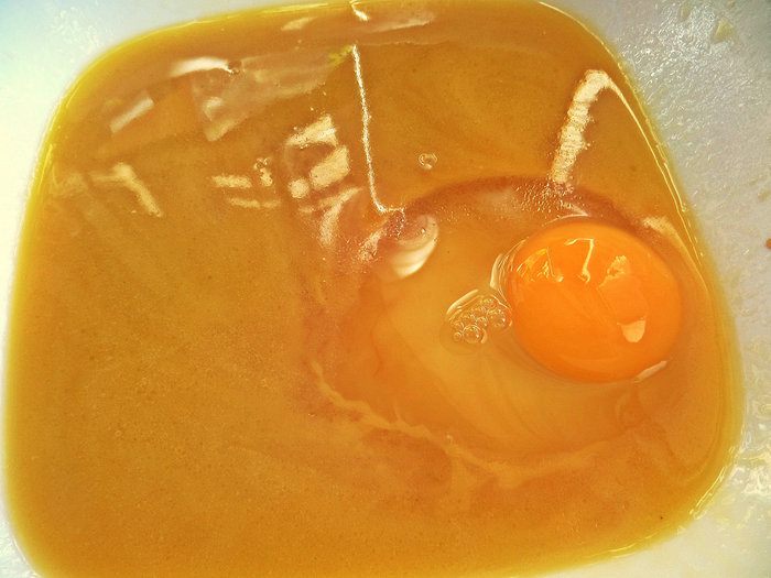 Теперь вбиваем яйцо, перемешиваем.