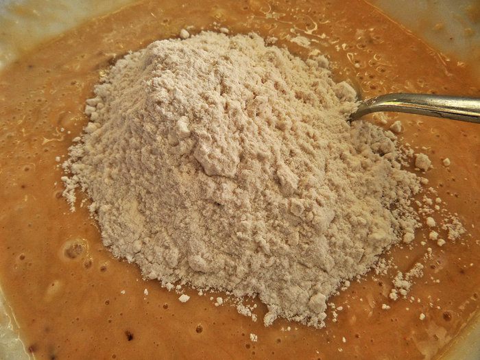 Всыпаем муку в жидкую основу по частям.