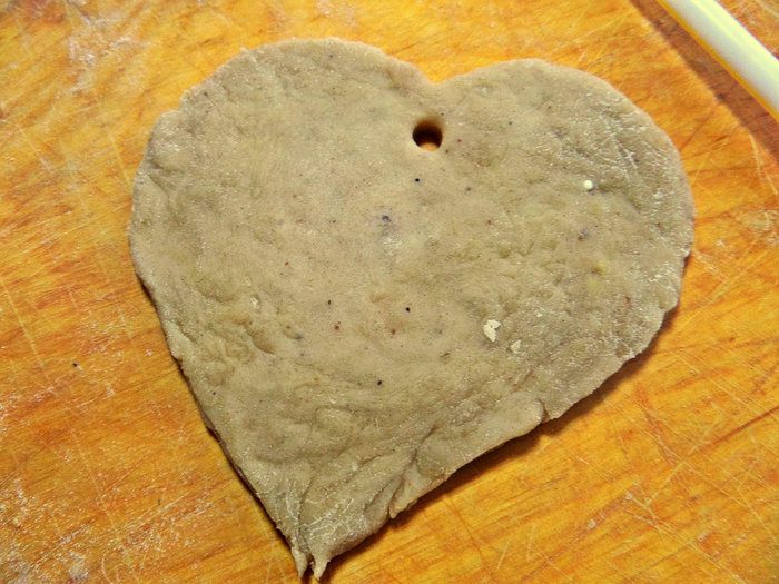 Ещё в Рождество дарят близким вот такие сердца. Вырезаем ножом из теста и проделываем соломинкой дырочку для ленточки.