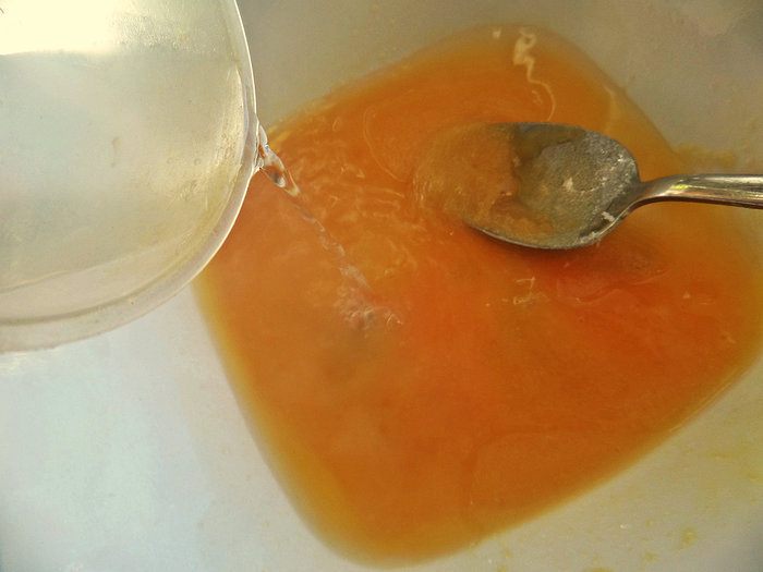 Влить тёплую воду, растереть всё.