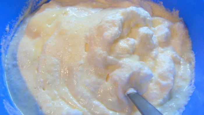 Добавляем желтково-сметанную массу, затем масляную и хорошо перемешиваем.