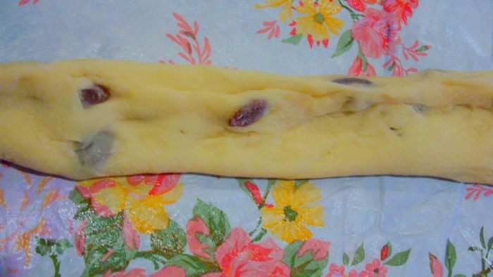 Можно испечь калачи с начинкой: отрываем от теста кусочек и раскатываем в "ленточки".