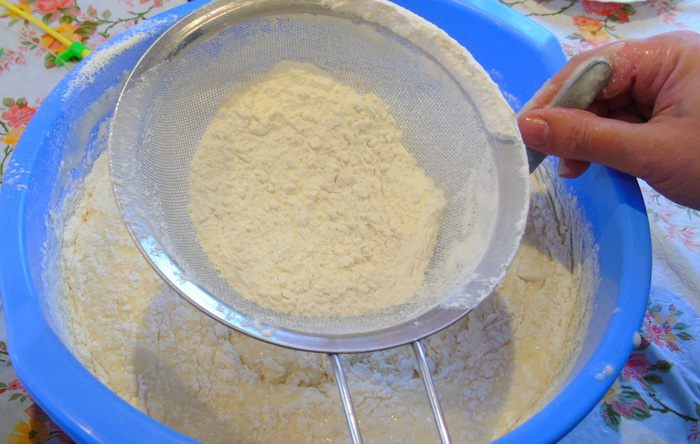 И начинаем постепенно добавлять муку, мука у меня уже просеянная, но все же я ее еще раз просеиваю, а тесто мешая ложкой.