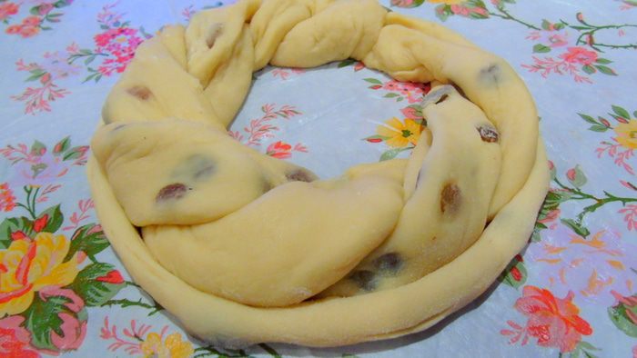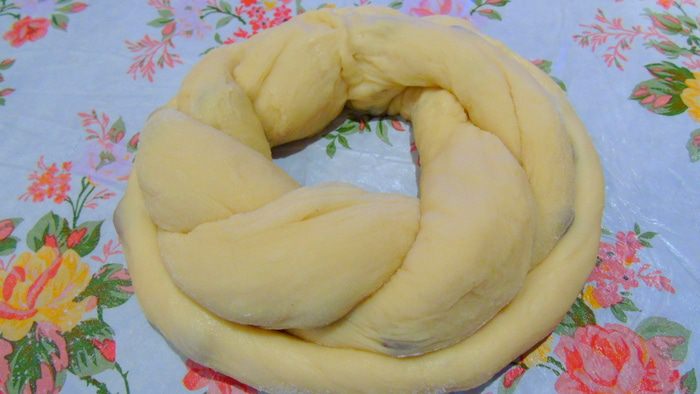 Переплетаем ленточки между собой, края соединяем образуя круг, теперь сплетаем "веревочку" и обвиваем низ калача. Даем минут 20 подойти, а этим временем разогреваем духовку до 200°С