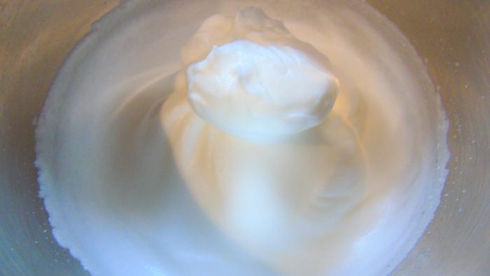 Белки взбиваем в крепкую пену.