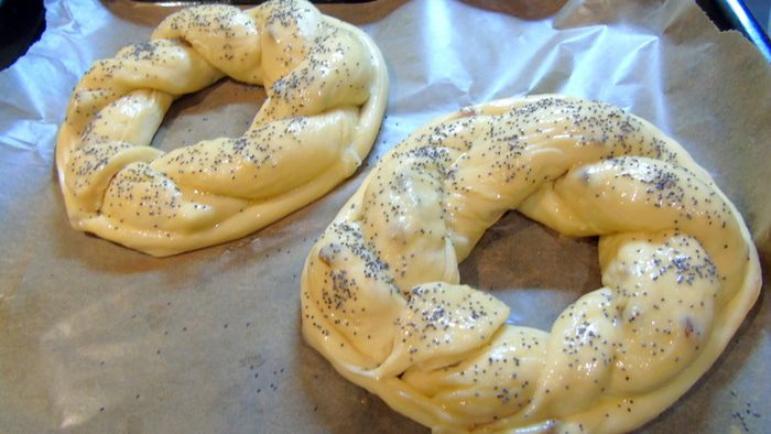 Шов калача можно украсить "листиком", "сердечком". Смазываем взбитым яйцом и присыпаем маком, отправляем в духовку до готовности, примерно на 30 минут, проверяйте деревянной шпажкой.