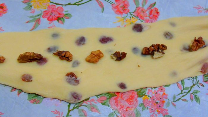 На "ленточки" выкладываем начинку, можно конфеты, можно орехи, цукаты, сухофрукты.