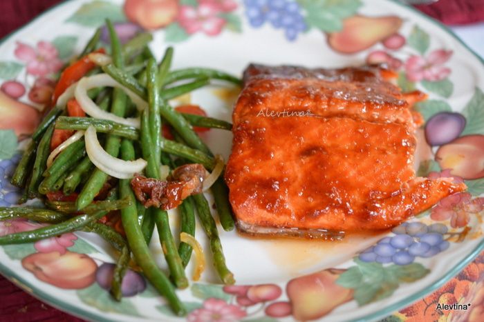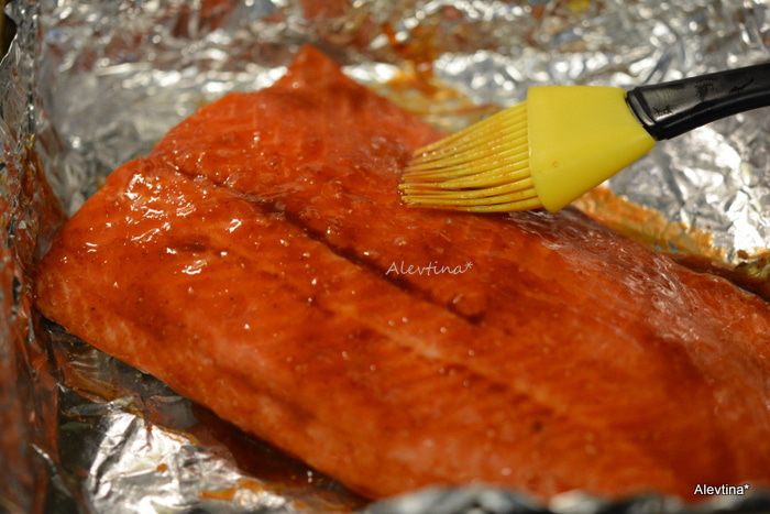 Смазать смешанным соусом рыбу, выложить на противень. Готовим на гриле или в духовке до готовности 20-25 минут.