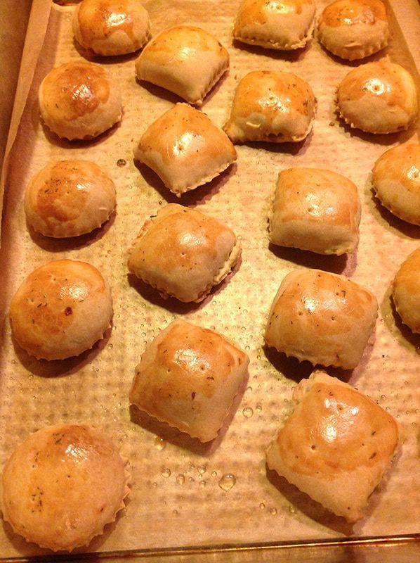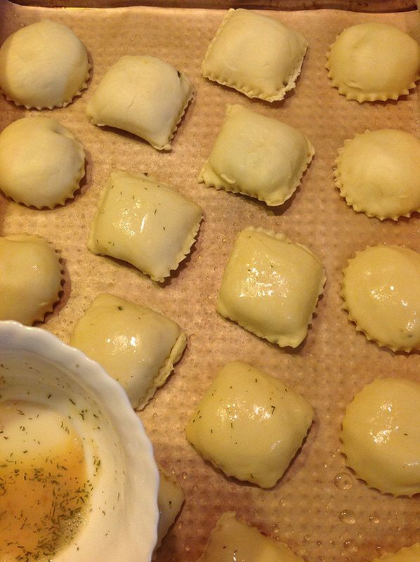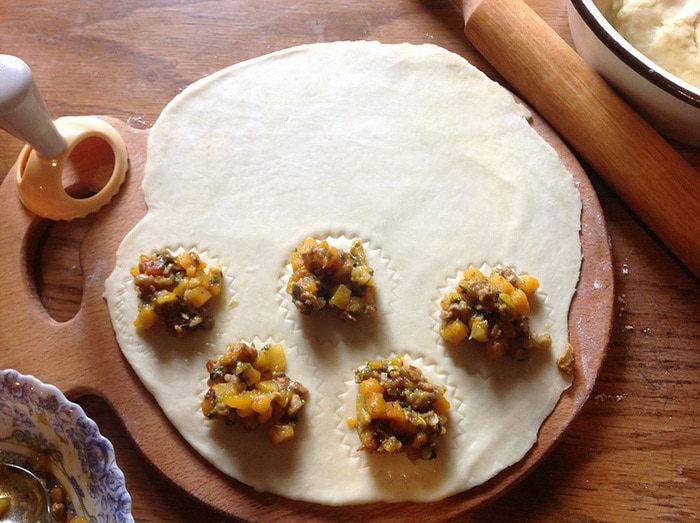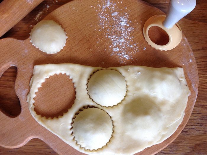 На слегка присыпанной мукой поверхности раскатать часть теста, не слишком тонко, 4-5 миллиметра толщиной. На одной половине наметить формочкой для равиоли или просто узким бокалом кружки. В эти кружки выкладывать начинку по чайной ложке.