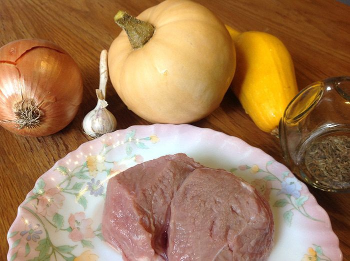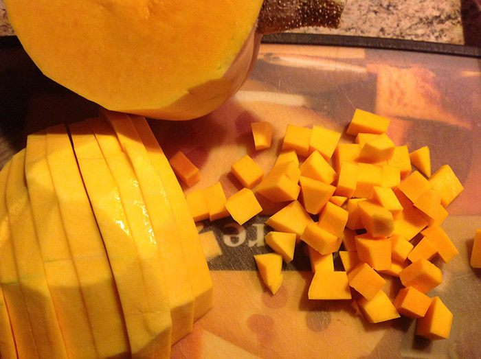 Тем временем подготовим овощи. Тыкву очистить от кожуры и семян, нарезать небольшими квадратиками, примерно полсантиметра толщиной. Цукини (можно заменить кабачком) тоже нарезать квадратиками.