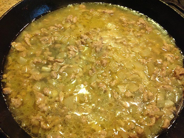 В глубокой сковороде на растительном масле довести лук до прозрачного цвета, затем добавить мясо. Прожарить минут пять на среднем огне.