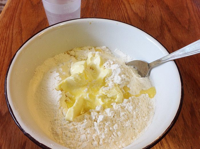 Начнем с теста. Просеять в миску муку, добавить мягкое сливочное масло, перемешать.