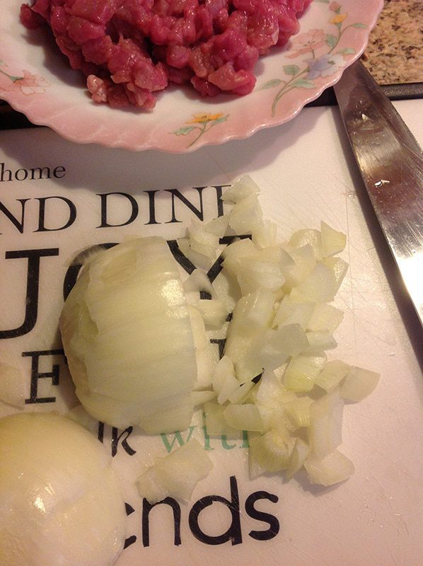 Займемся начинкой. Мясо вымыть и нарезать тонкими полосочками. Не надо перекручивать в фарш! Просто мелко нарезать ножом.