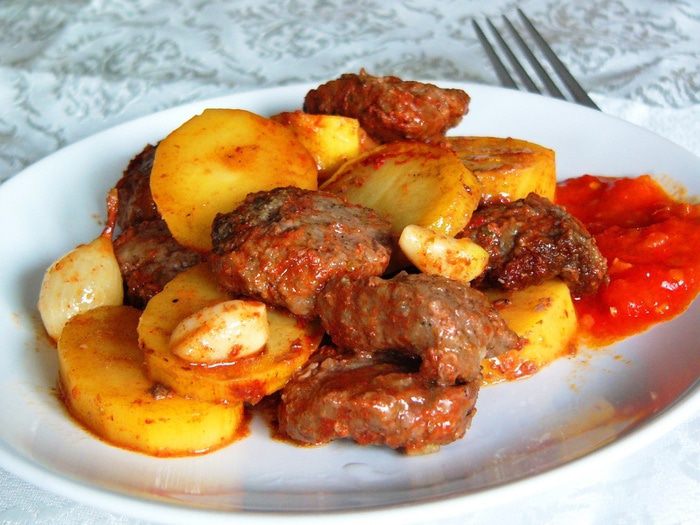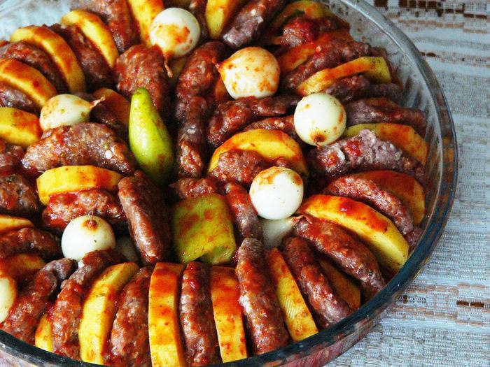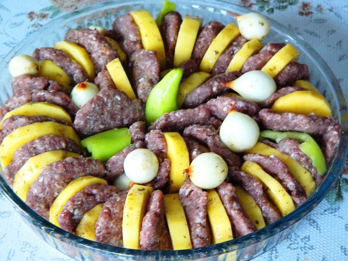 Выкладываем котлеты и овощи на блюдо для запекания, чередуя: котлета-картошка-лук и так далее (можно оставить только картофель и котлеты). У меня в этот раз был лук-шалот. Чеснок раскладываем в промежутки.