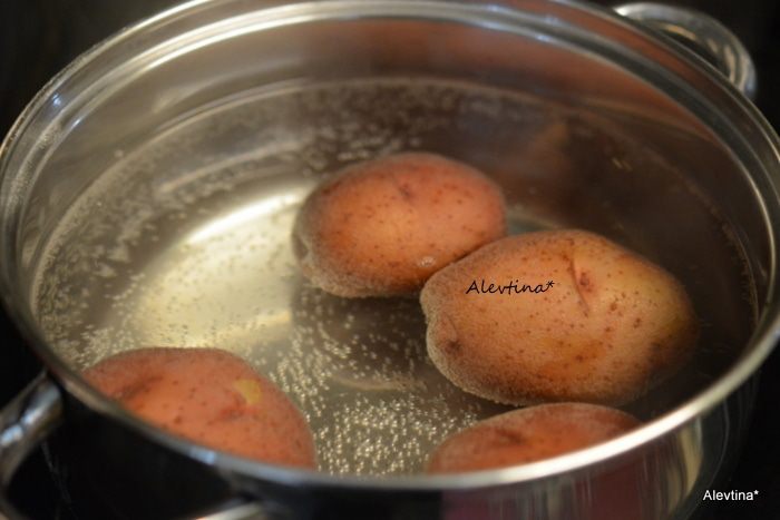 Отварить среднего размера картофель до готовности в соленой воде. Слить воду.