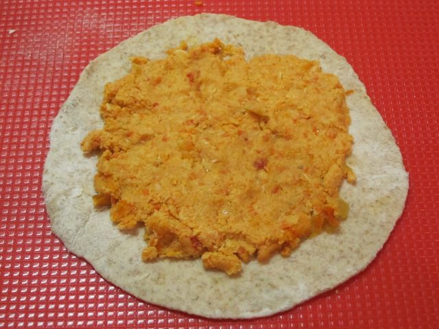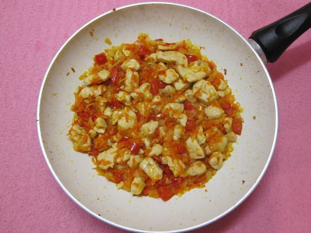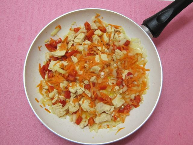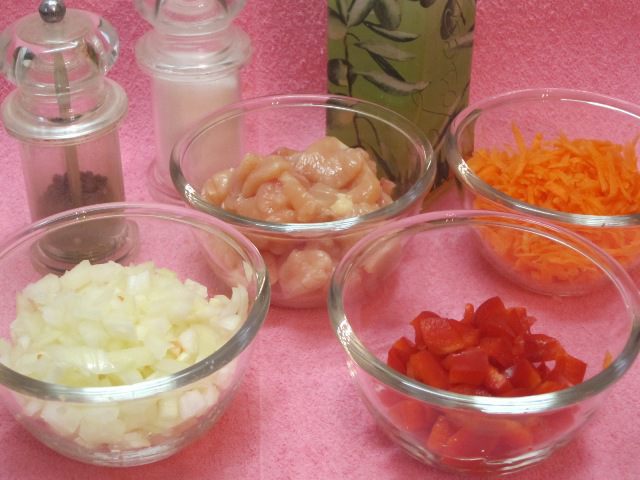 Пока тесто отдыхает и набухает, будем делать начинку. Куриное филе вымыть, нарезать небольшими кусочками. Репчатый лук и красный перец нарезать небольшими кубиками, можно и большими, это не принципиально, потому что потом все обжарится и измельчится блендером. Морковь очистить и натереть на крупной терке.