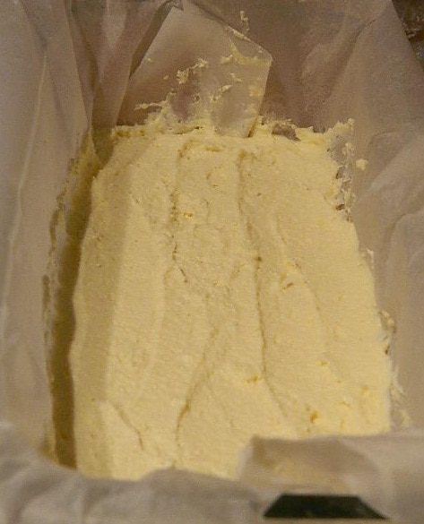 Форму смазать маслом и выстелить пекарской бумагой. На дно формы выложить творожную массу. Разровнять.