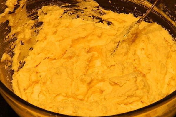 В миске взбить творог, мягкое сливочное масло, 100 г сахара, манную крупу, яйца и 1 ст. л. крахмала.