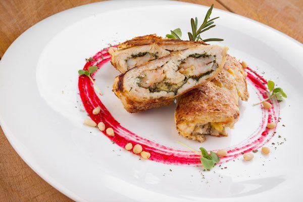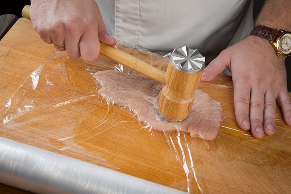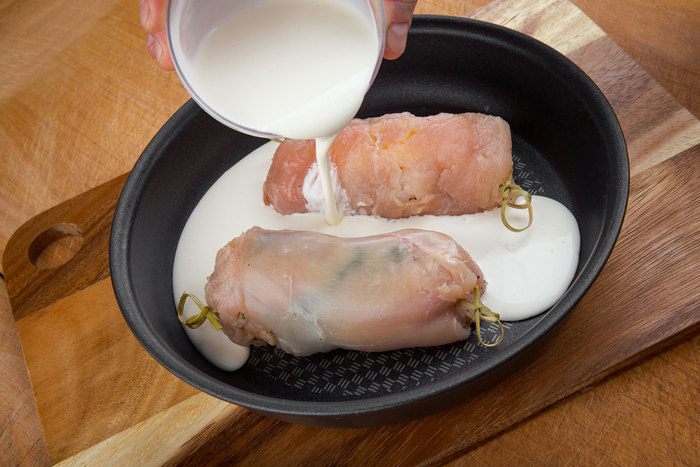 Аккуратно завернуть, чтобы не повредить мясо и скрепить зубочисткой или кулинарной нитью.