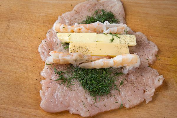 На каждый пласт выложить по 1 ст. л. рубленного укропа, заранее отваренные и очищенные креветки, по брусочку сыра и сливочного масла. С твердым сыром "Брест-Литовск" блюдо получается очень сочным и нежным.
