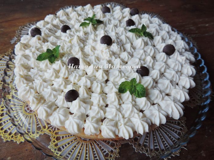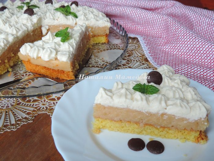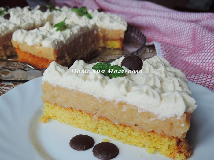 В его составе бисквитный слой-основа, толстый слой яблочной начинки и все это увенчано пышной "шапкой" из взбитых сливок.