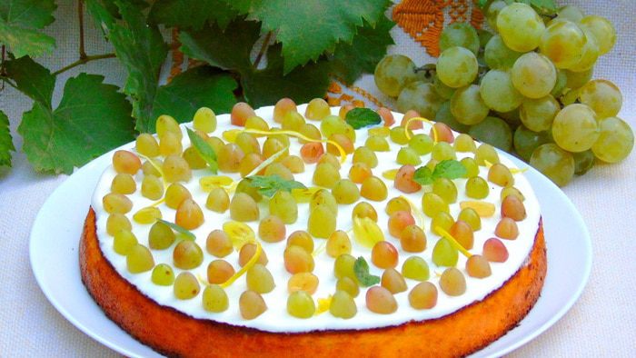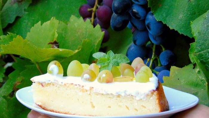 Очень нежный и вкусный манник, а с виноградом детям точно понравится и украшать, и кушать.