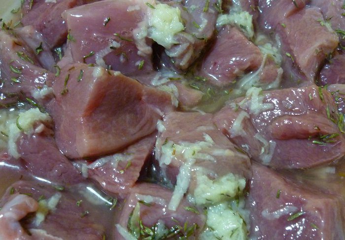 Снимаем кожу с филе, нарезаем на небольшие кусочки. В миске смешиваем сок лимона, натертый чеснок и тимьян (только листики). Кладем в маринад утку, перемешиваем и оставляем мариноваться на 20 минут.