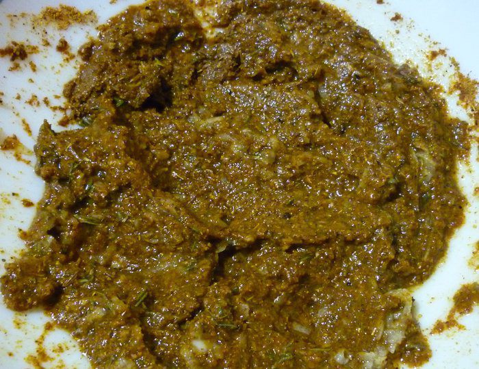 Готовим пасту карри. Для этого кладем в миску порошок карри, корицу, мускатный орех, гвоздику, листики тимьяна и натертый чеснок. Добавляем воду и перемешиваем до однородности.