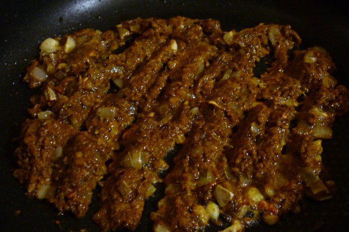 Добавляем пасту карри и жарим, помешивая, еще около 1 минуты.
