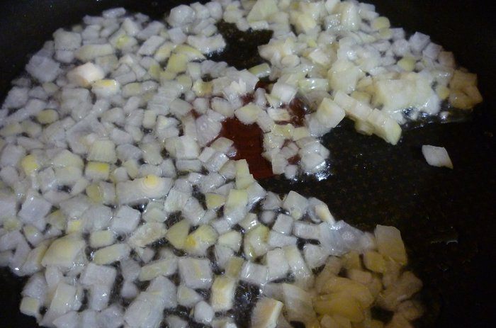 Мелко рубим лук. В сотейнике разогреваем 2 ст.л. растительного масла. Жарим, помешивая, на среднем огне около 5 минут.